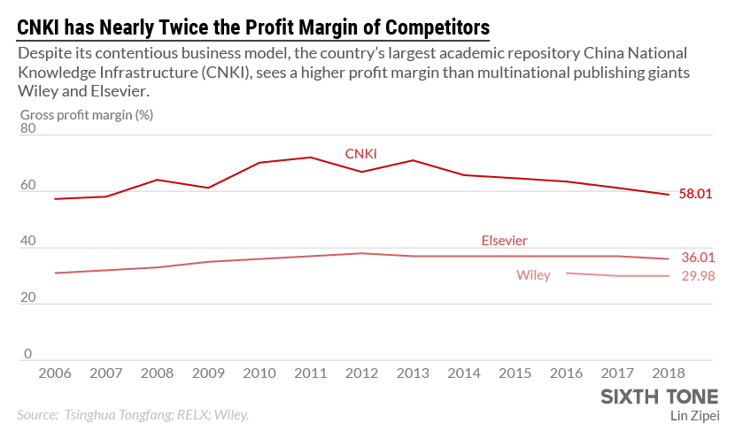 Besides all the effort CNKI has made to develop open-access (OA), there are many challenges it is facing. One survey of Chinese readers conducted by Wen revealed the fact that 94.5 percent of the respondents were ignorant of the existence of OA journals.[9] As we mentioned before, the market share of CNKI in Chinese undergraduate colleges is 100% which keeps CNKI the Chinese world of academic publishing in a monopolistic stranglehold. According to Wang Yiwei’s article on July 24, 2019, CNKI has posted an average annual profit margin of nearly 60%in the past decade which almost doubled the figure of Wiley [10].