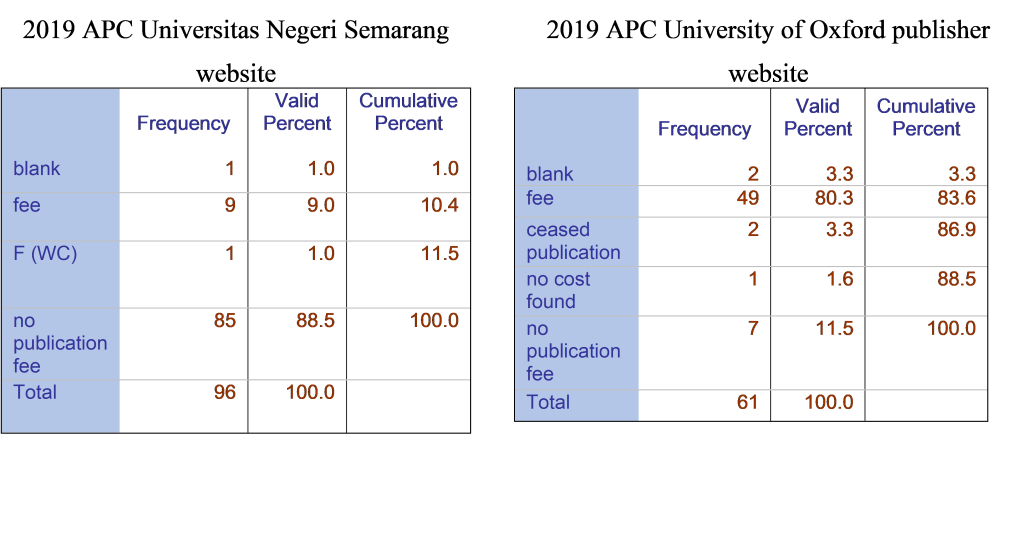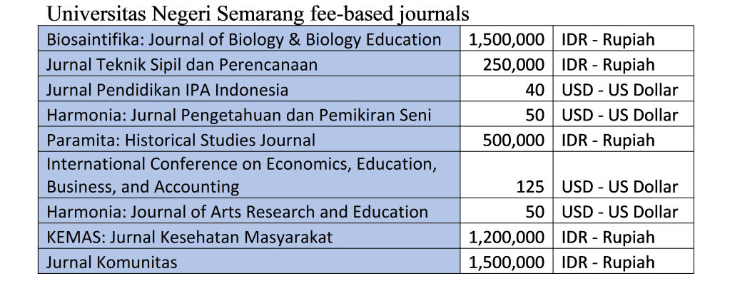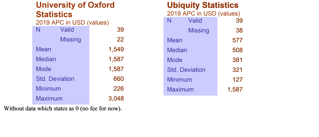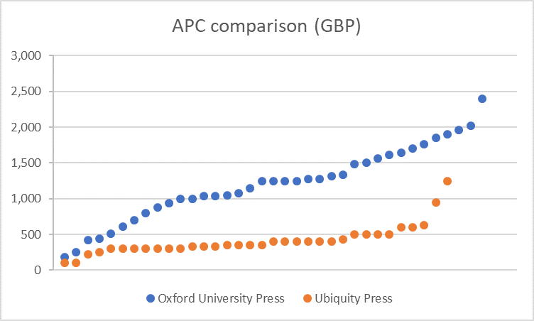 Shi & Morrison’s (2019) findings illustrate that charging trends can vary considerable by publisher. 4 pairs of publishers and sub-publishers are compared. Two Wolters Kluwer imprints, Medknow and Lippincott, are quite different in APCs. Medknow journals tend not to charge, and those that have APCs tend to have relatively low APCs. Lippincott journals tend to charge, at above-average rates. Two universities, Indonesia’s Universitas Negeri Semerang (UNS) (now one of the largest publishers in DOAJ) and Oxford are compared. Oxford is one of the world’s oldest publishers, is UK based, and tends to charge APCs at above-average rates. UNS appears to be a newcomer to online publishing, uses the open source Open Journal System; UNS journals tend not to charge, and when they do charge, prices are relatively low. Oxford was also compared with another UK-based publisher, Ubiquity Press. Ubiquity Press is a new not-for-profit designed to produce OA works and also to achieve cost efficiency. It appears that Ubiquity is having success with the latter, as their average APC is a fraction of that of Oxford. MDPI and Hindawi are compared; both are new commercial APC-based publishers, but the average APC is much higher for Hindawi than for MDPI. This evidence supports the hypothesis that the global average APC masks considerable variation based on publisher history and strategy.