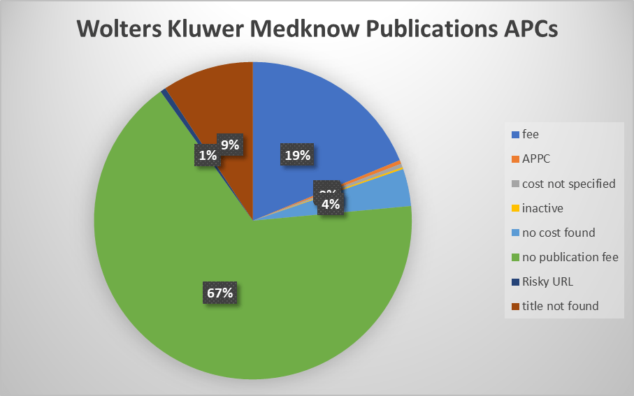 Avasthi & Morrison (2019) explore one of these publishers, Medknow, in more depth, and ask whether this approach is the best for India, the original home of the publisher before acquisition by Wolters Kluwer. It appears that the reason most Medknow journals do not have publication charges is because of numerous partnerships between Wolters Kluwer and scholarly societies and universities. Medknow has expanded beyond India, and has grown quite a bit in both 2018 and 2019. The number of “title not found” and a couple of “risky URL” (a code for when the URL on the publisher’s website leads to a website that is clearly not a journal and gives the appearance of a possible scam) raises some questions about whether the quality of service these journals receive are what they expect and deserve through a partnership with one of the world’s oldest EU-based commercial scholarly publishers.