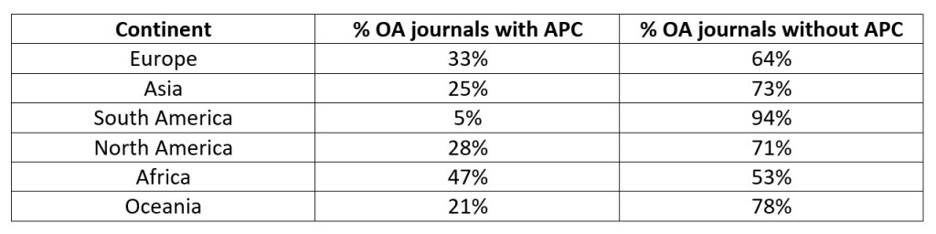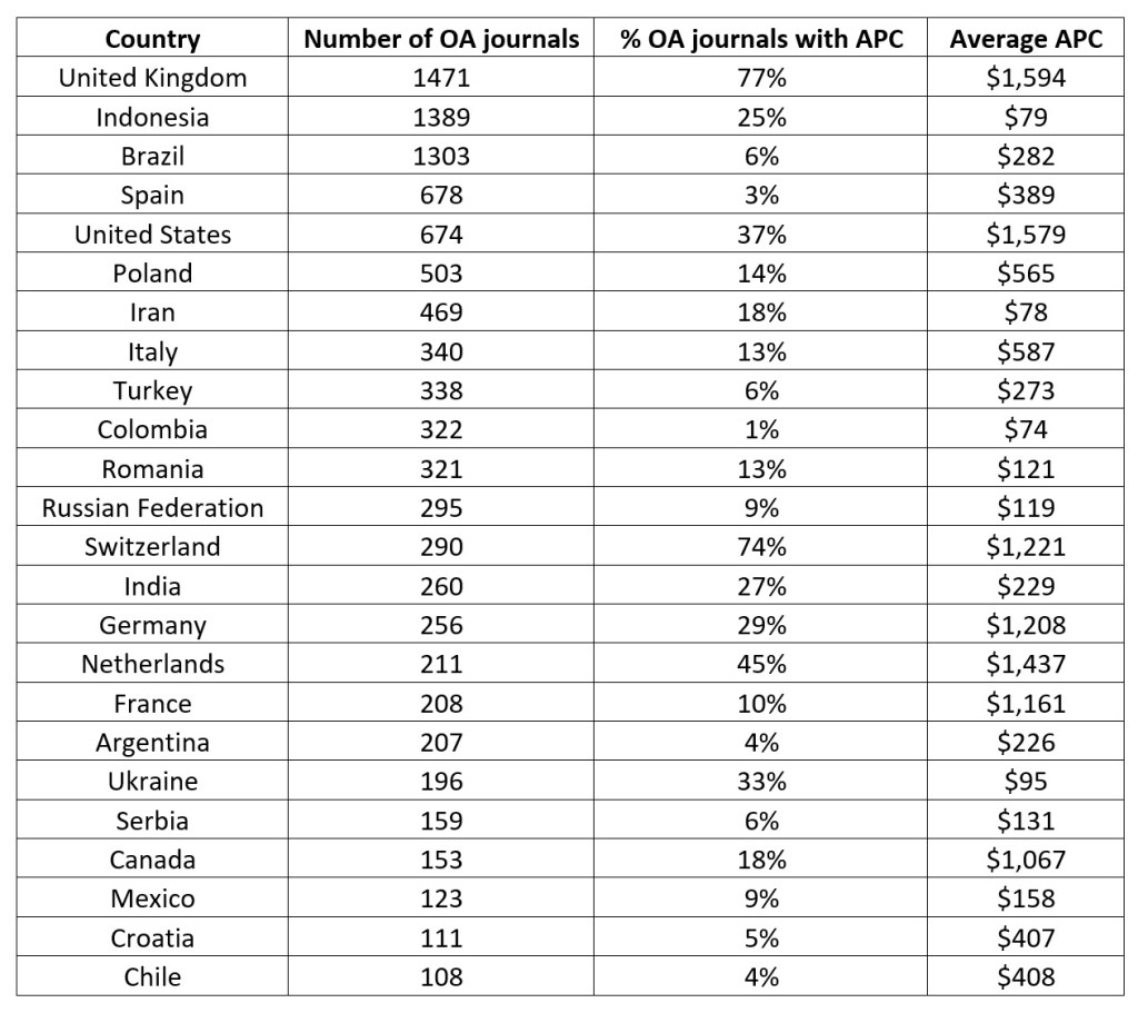 Pashaei & Morrison (2019c) studied the correlation of country in DOAJ, OA journal publishing, and APC. As expected, Europe, the US, and Latin America are well represented in DOAJ. There were some surprises. Indonesia is now the second largest country in DOAJ, and Poland, Iran, and Turkey, are among the top 10. This may reflect the work of the DOAJ ambassadors’ program. Tendency to charge and average APC both vary quite a bit depending on the publisher in question.